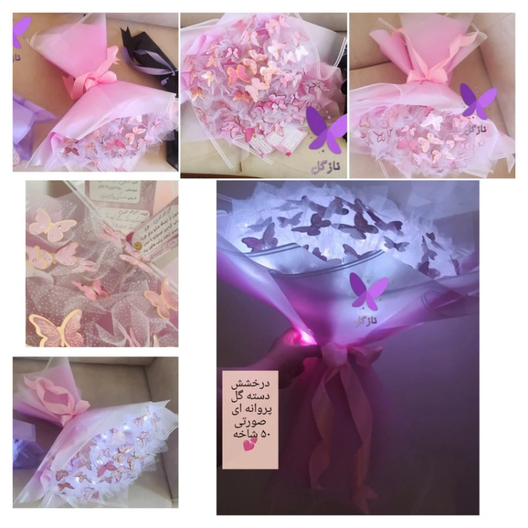 دستهگل پروانهای؛ یک هدیه به زیبایی و درخشش بال پروانهها در شب دستهگل پروانهای همان هدیه ماندگار و فراموشنشدنی است که به طرف مقابل، حس خاص بودن میدهد؛ هدیهای که از نظر زیبایی، مثل لطافت بالزدن پروانهها در یک باغ زیبا یا درخشش آنها در یک شب رؤیایی است. دسته گل پروانه ای قابل سفارش با پر و هر تعداد شاخه ی مد نظر شما می باشد.