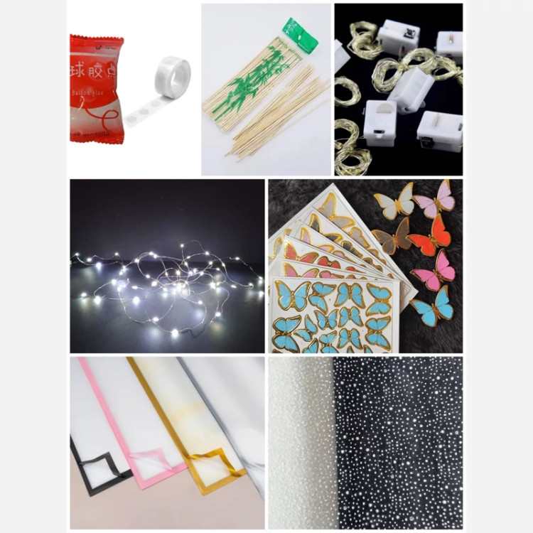 لوازم گلسازی مخصوص دسته گل پروانه ای تمامی محصولات با رنگبندی دلخواه موجوده. به راحتی از یکجا تمامی اقلام مورد نیازتان را تهیه کنید 😍💪. این بسته شامل 🌷1 ورق 34 عددی پروانه مقوایی با روکش سلفون ضد آب با رنگ دلخواه شما.🦋 🌷 5 عدد کاغذ ضد آب مخصوص دور پیچ دسته گل ابعاد 58×58 با رنگ دلخواه .🌈 🌷 یک متر تور برفی سفید زیبا 🤍 🌷 یک عدد ریسه ال ای دی دو متری باتری سرخود ✨ 🌷یک عدد چسب دو طرفه (صدتایی) 🌷دو متر روبان ساتن 2,5 سانت برای پاپیون در رنگ دلخواه شما 💓 🌷تعداد 20 عدد سیخ چوبی برای شاخه گل